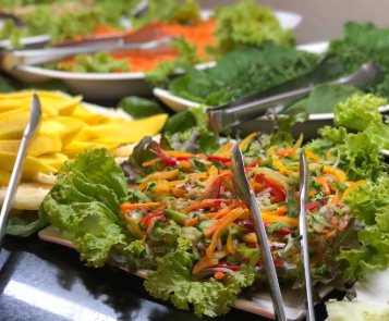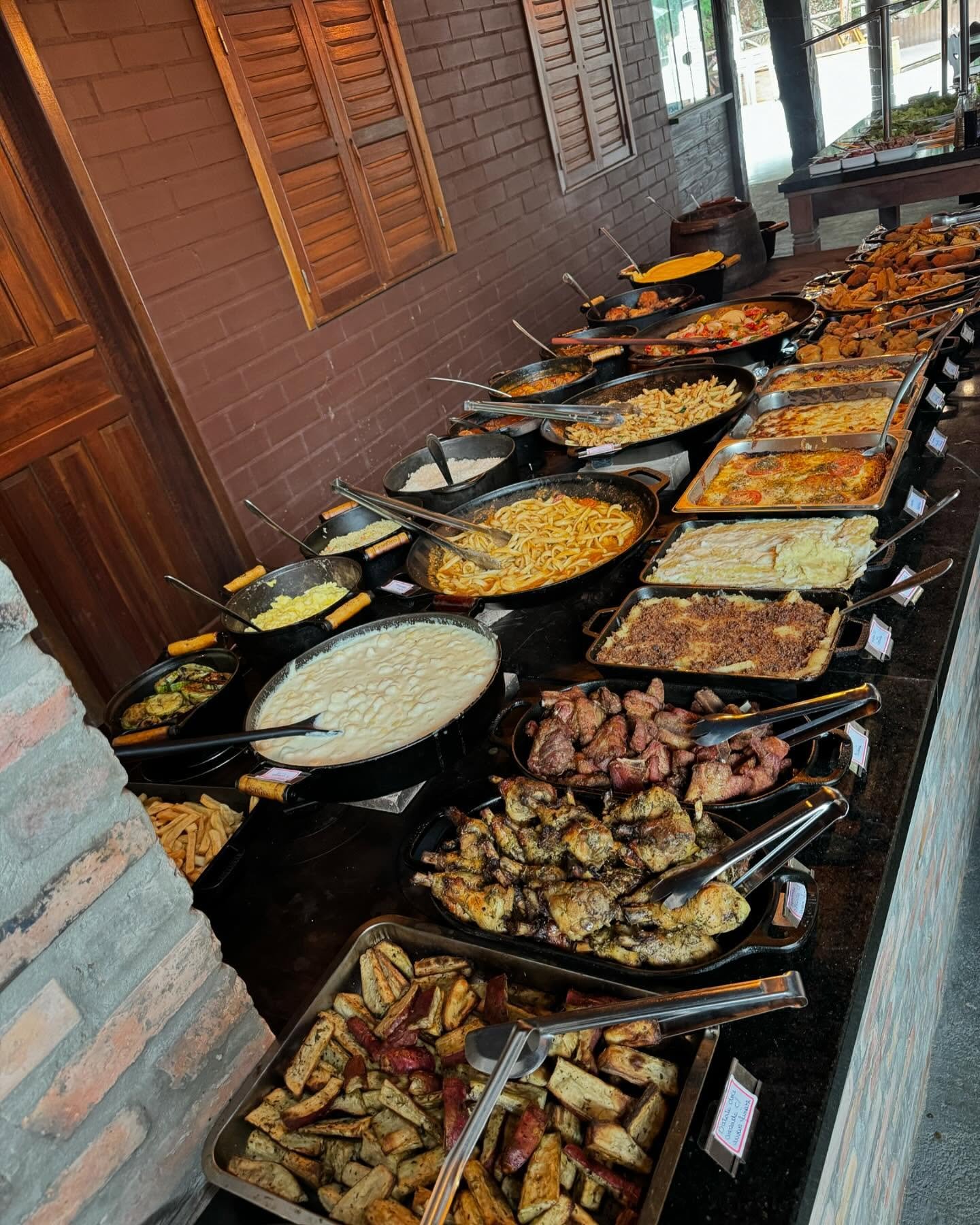 O buffet também conta com um churrasco preparado na hora, com carnes selecionadas e cortes suculentos, além de uma variedade de saladas frescas e sobremesas caseiras, como doces tradicionais